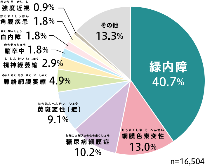 障害者手帳発行数から推定される、日本人における視覚障害の原因疾患の第1位は緑内障です1)。治療せずに放っておくと失明につながるおそれがあります。40歳以上の日本人の20人に1人が緑内障と推定されていますが、なんと9割の方がまだ気づいていないと考えられています2)。